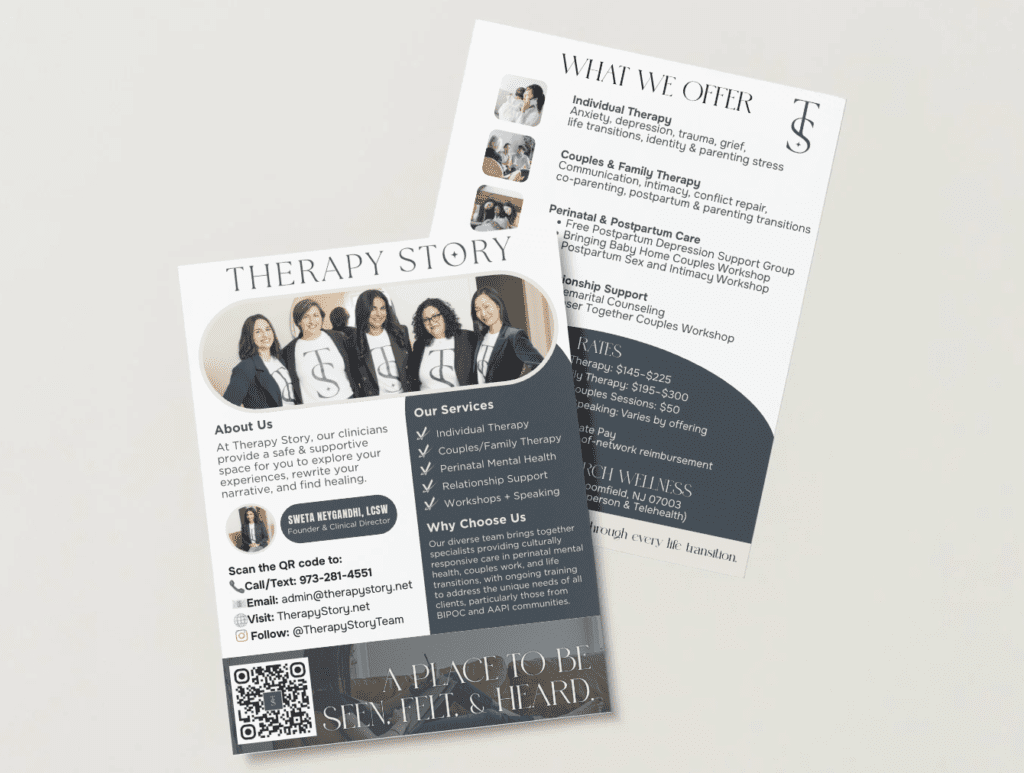 Curious about working with us? Our Services & Rates flyer breaks down how Therapy Story supports individuals, couples, and organizations through therapy and workshops, along with transparent starting rates to help you plan your next step.