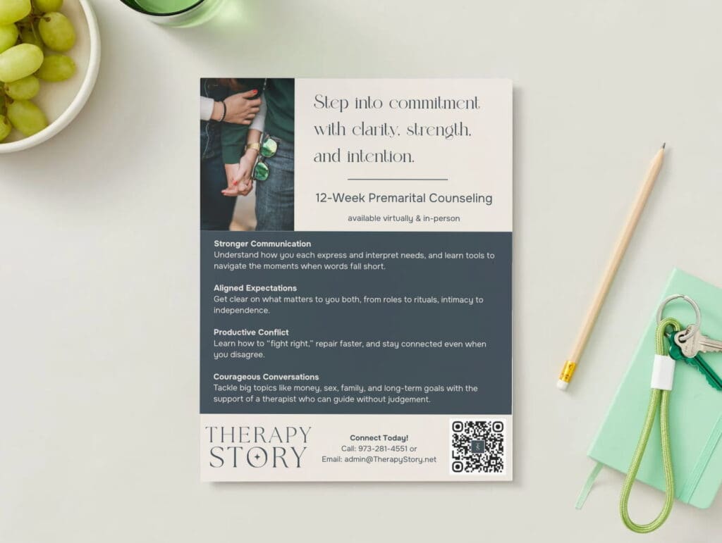Download our Premarital Counseling flyer to learn how Therapy Story helps couples build a strong foundation before marriage. Explore topics like communication, conflict resolution, intimacy, and shared values as you prepare for this next chapter together.