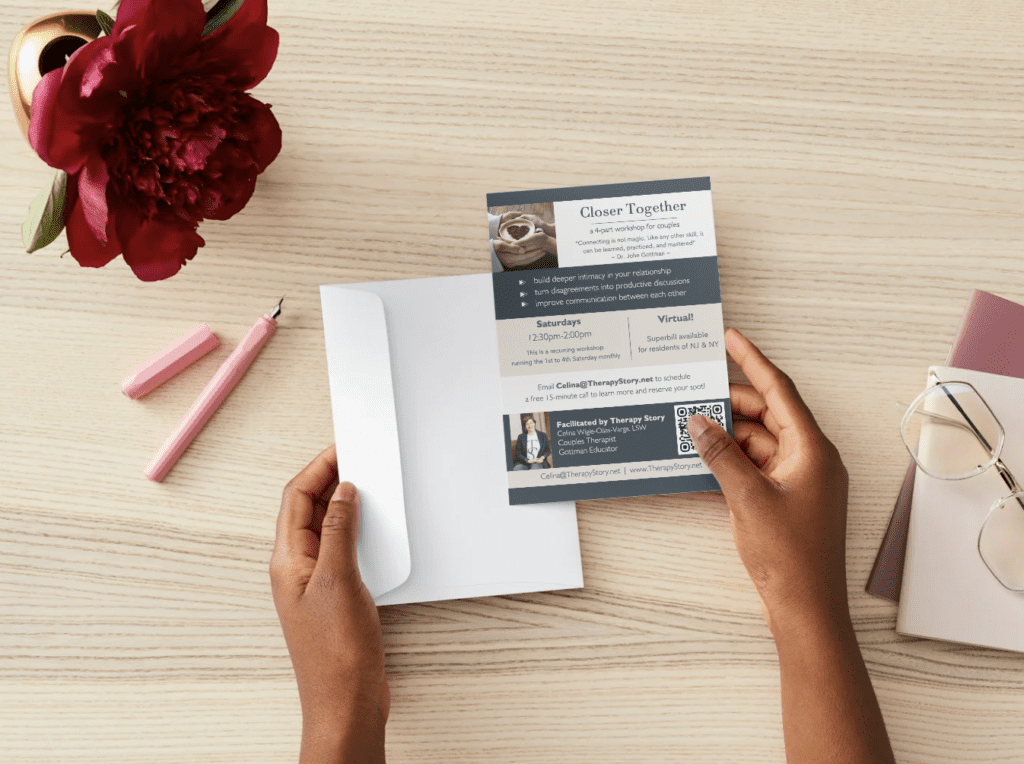 Download our Closer Together Couples Workshop flyer to learn how Therapy Story helps couples reconnect, strengthen communication, and deepen emotional and physical intimacy in a supportive, guided space.