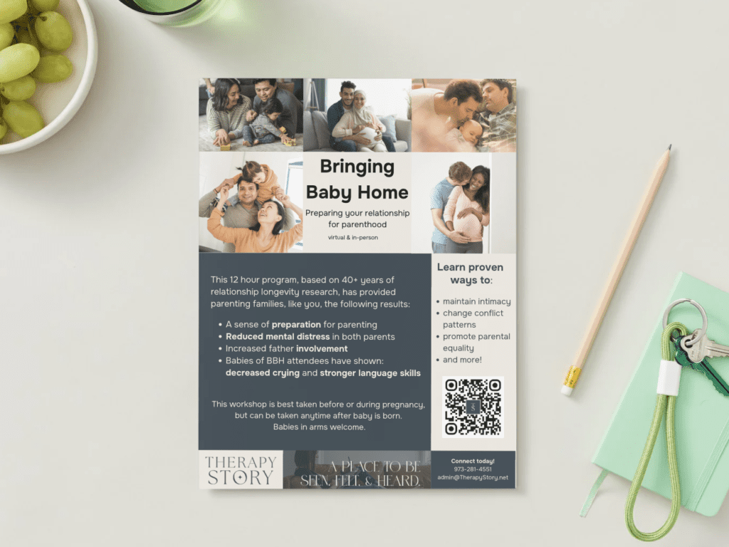 Download our Bringing Baby Home flyer to learn how Therapy Story supports couples as they transition into parenthood. This workshop helps strengthen communication, manage stress, and deepen connection during one of life’s biggest changes.