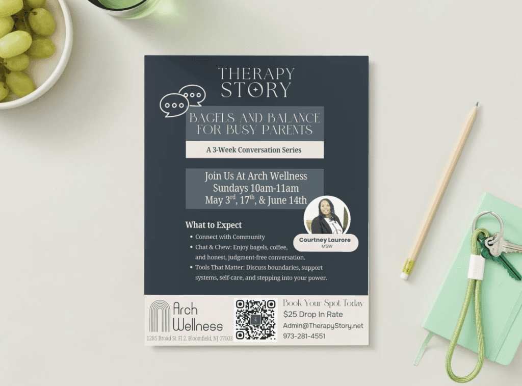 Download our Bagels and Balance Speaker Seried flyer to share with busy parents looking to connect with others and walk away with tangible tools from our social worker and educator Courtney Laurore, MSW.